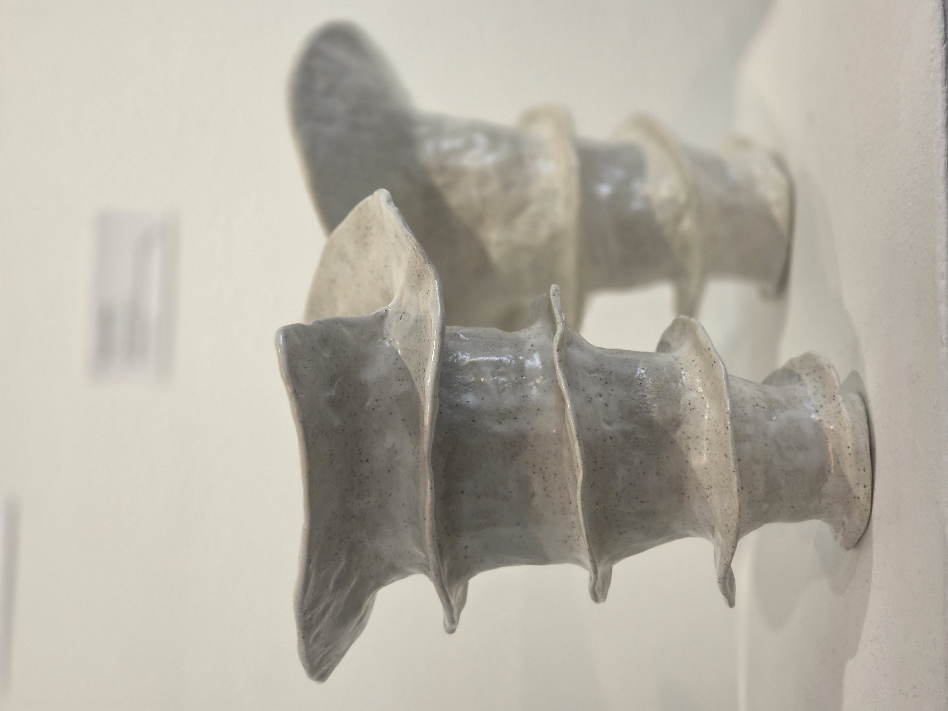 Materials: Pinch and coiled white speckle stoneware with satin glaze