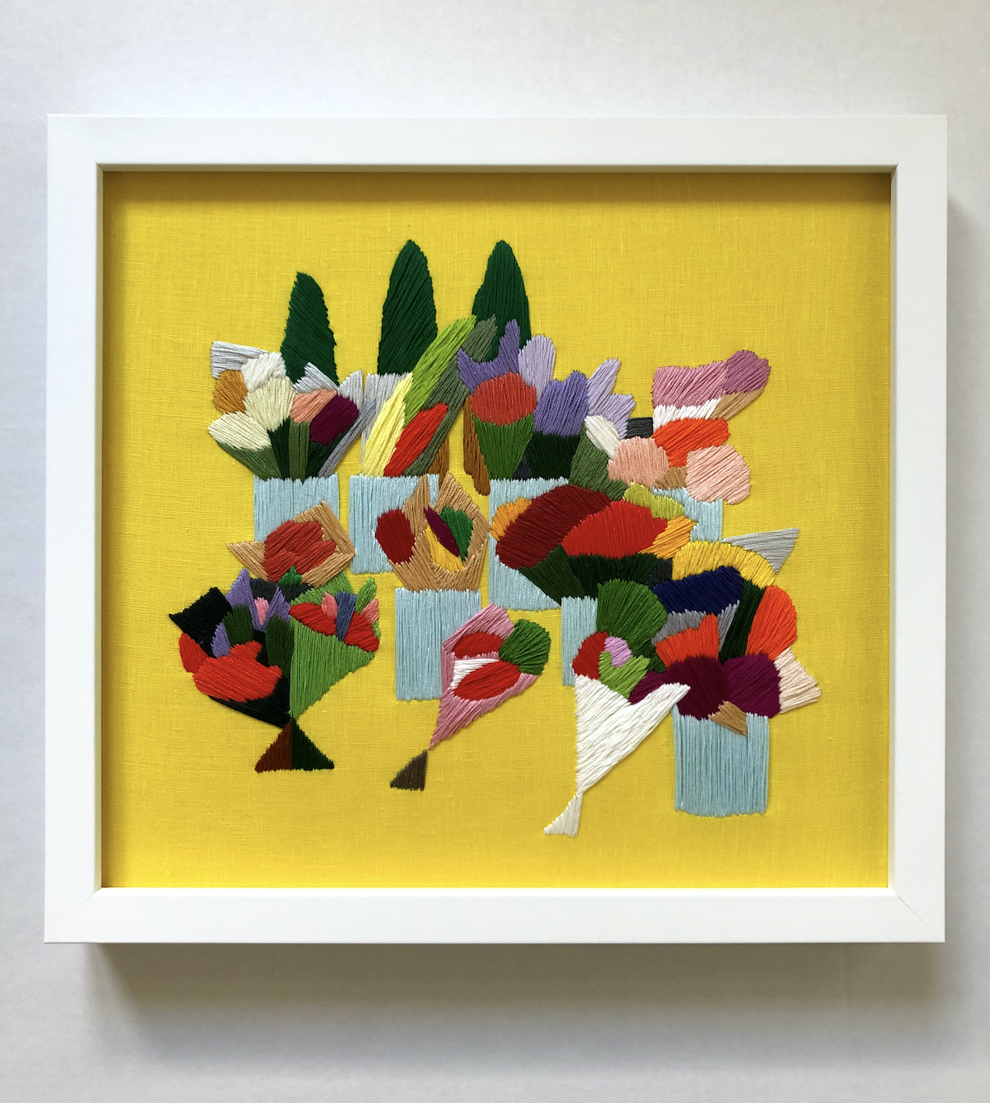 I'm constantly inspired by my weekly supermarket shopping trips and the ever-changing blur of plastic and flowers by the front doors. By documenting, then abstracting the colourful arrangements made by anonymous workers I'm celebrating a small joy in everyday life.